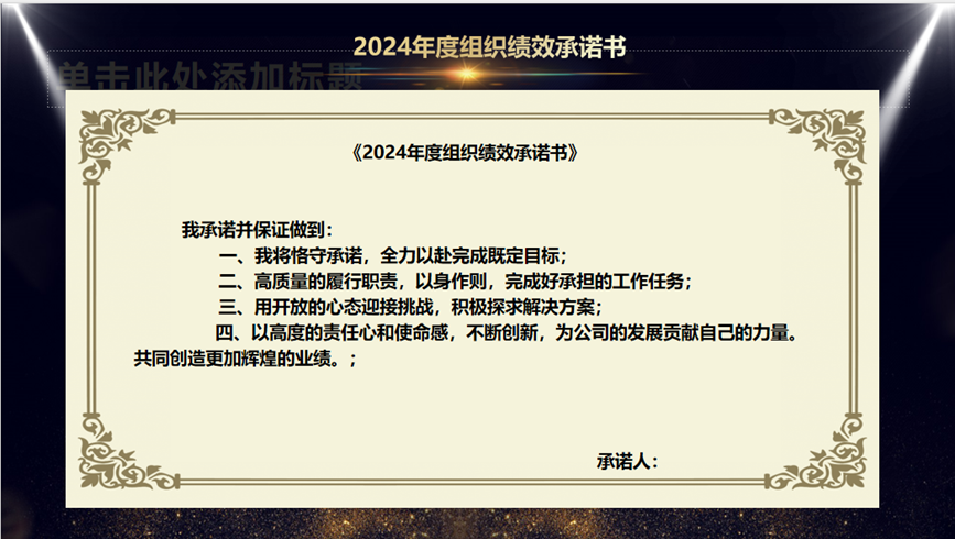 簽署績(jī)效指標(biāo)責(zé)任書是為了更好地明確任務(wù),強(qiáng)化責(zé)任。總經(jīng)理寄語(yǔ)全體同仁,要以高度的責(zé)任感和飽滿的熱情投入工作,共同為達(dá)成公司2024年度的戰(zhàn)略發(fā)展目標(biāo)而努力奮斗。